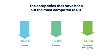 Compared to their draft determination responses, the companies that have been cut the most are Wessex Water (-16.8%), Thames Water (-16.4%), and Sutton and East Surrey Water (-14.3%). Whereas a clutch of companies have been awarded slightly more than they requested or have only received a minor cut.
